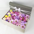 Белые гвоздики и розы в коробке