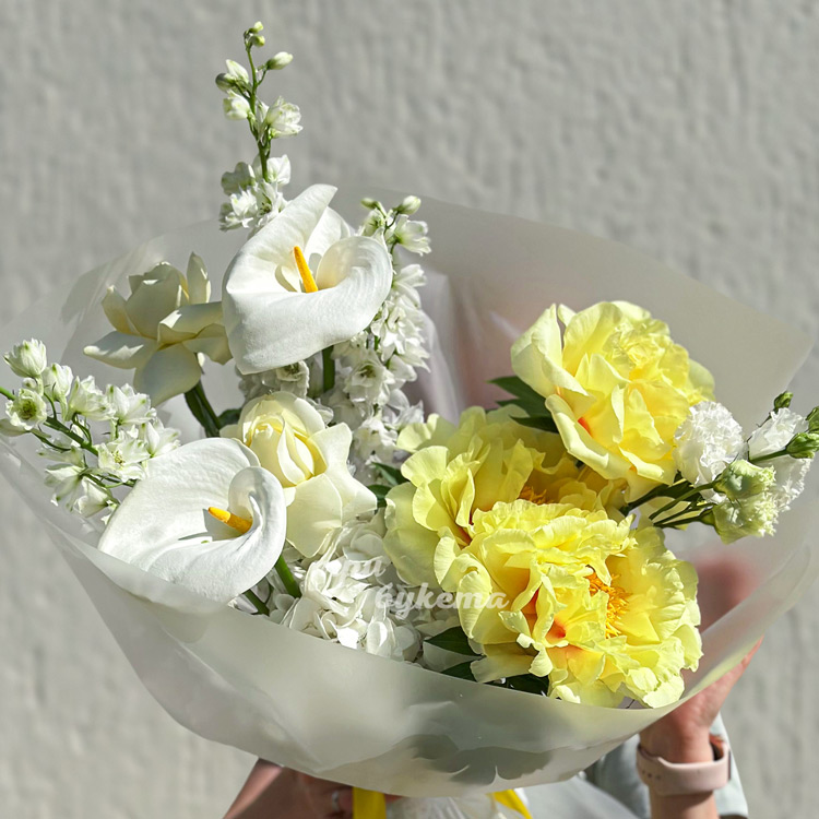Букет белых дельфиниумов и желтых пионов