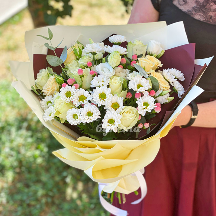 Букет из белых роз и хризантем