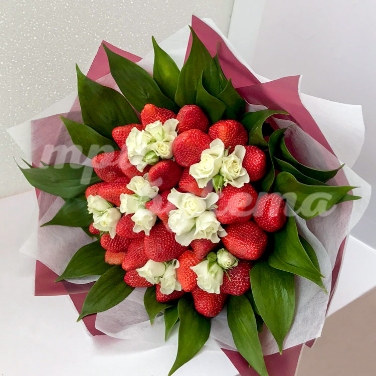Букет из белых роз с клубникой