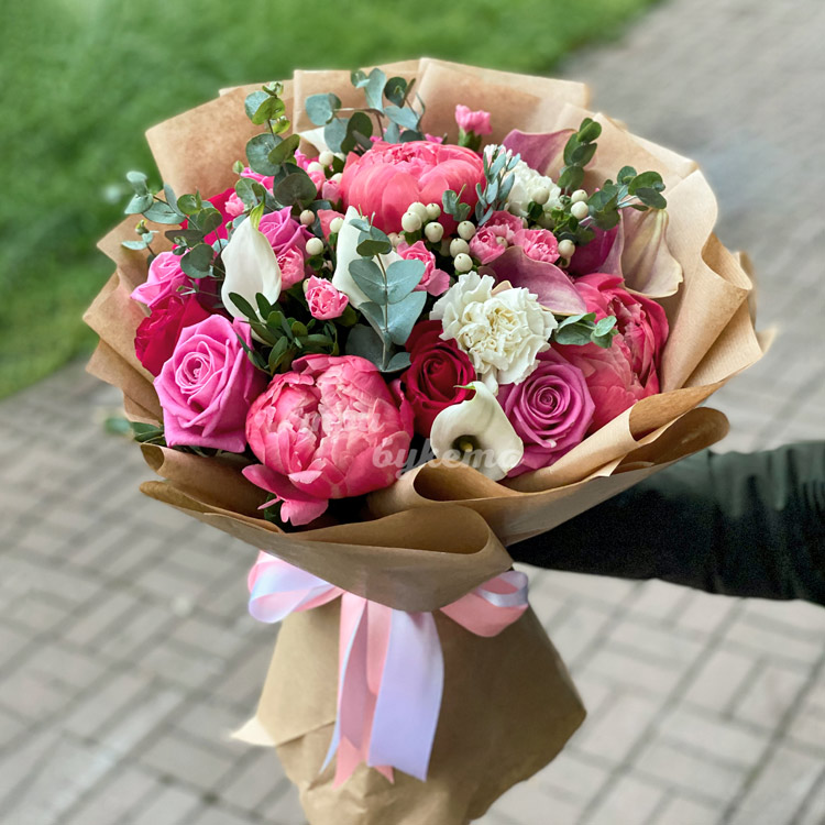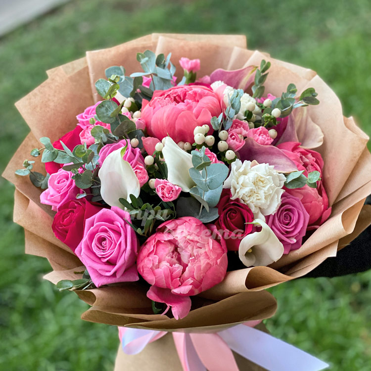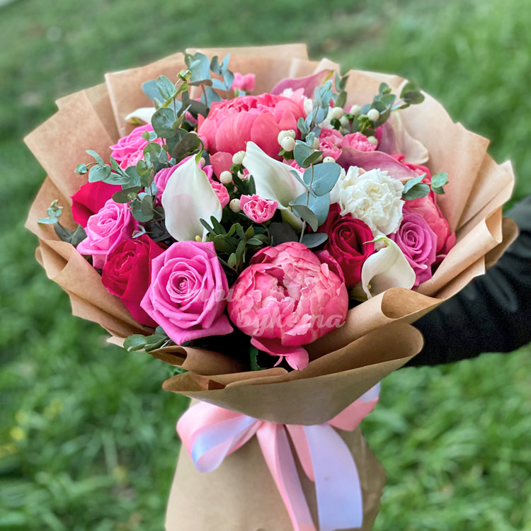 Букет из пионов в крафт-бумаге