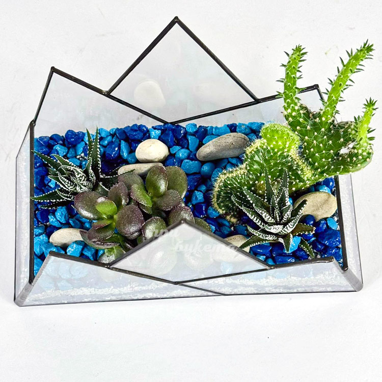 Флорариум с синими камешками, кактусами и суккулентами
