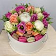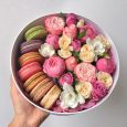 Коробка из 6 макарун, хризантем и роз