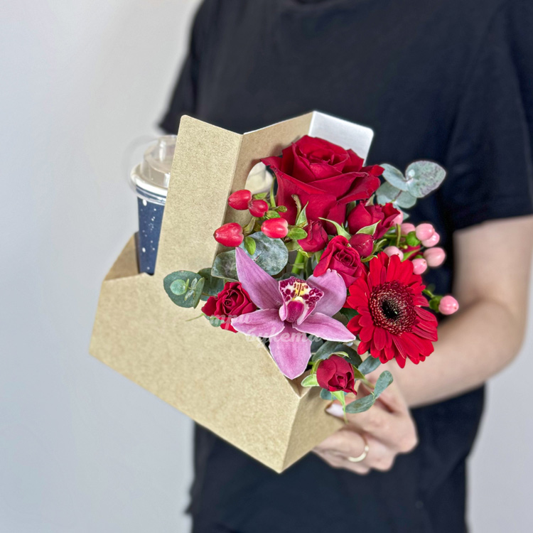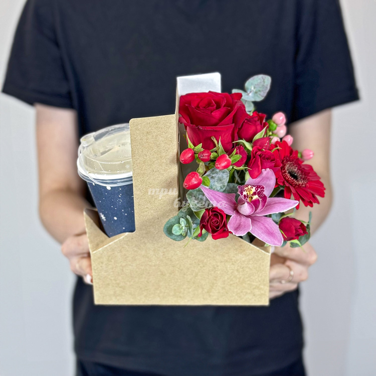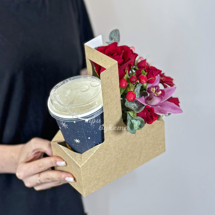 Коробочка с кофе, розами и орхидеей