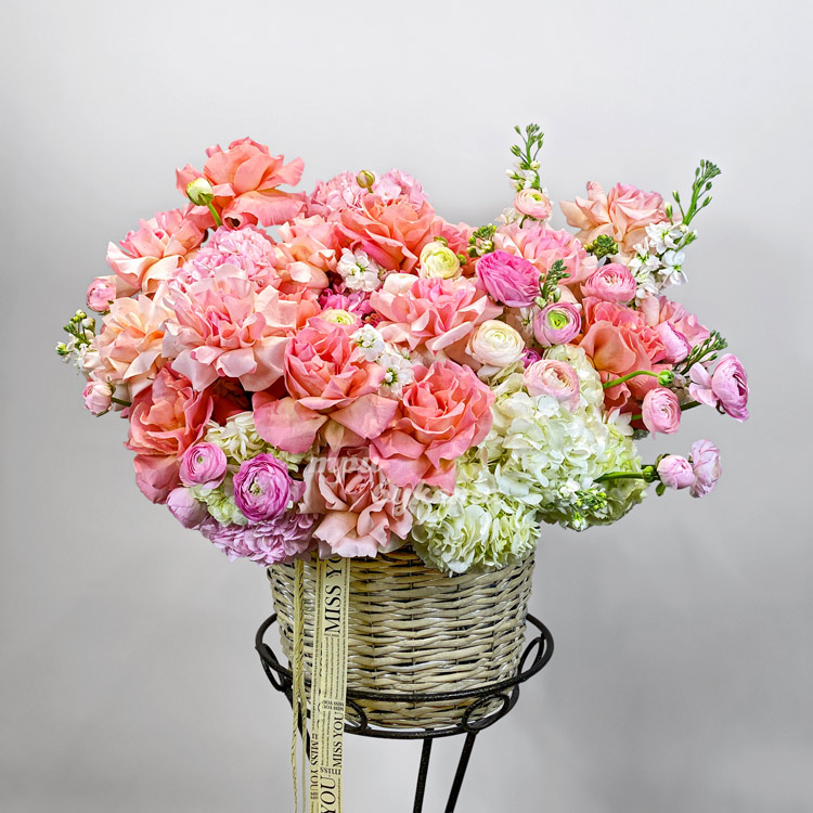 Корзина коралловых роз с гортензиями