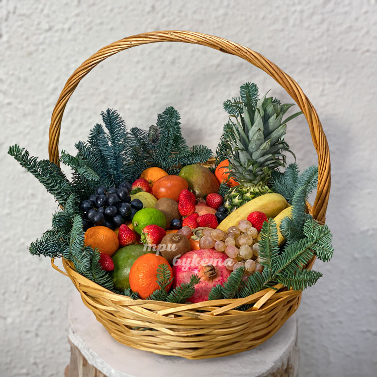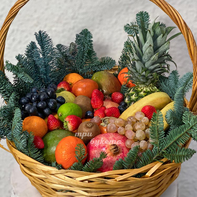 Корзина на новый год с фруктами с хвоей