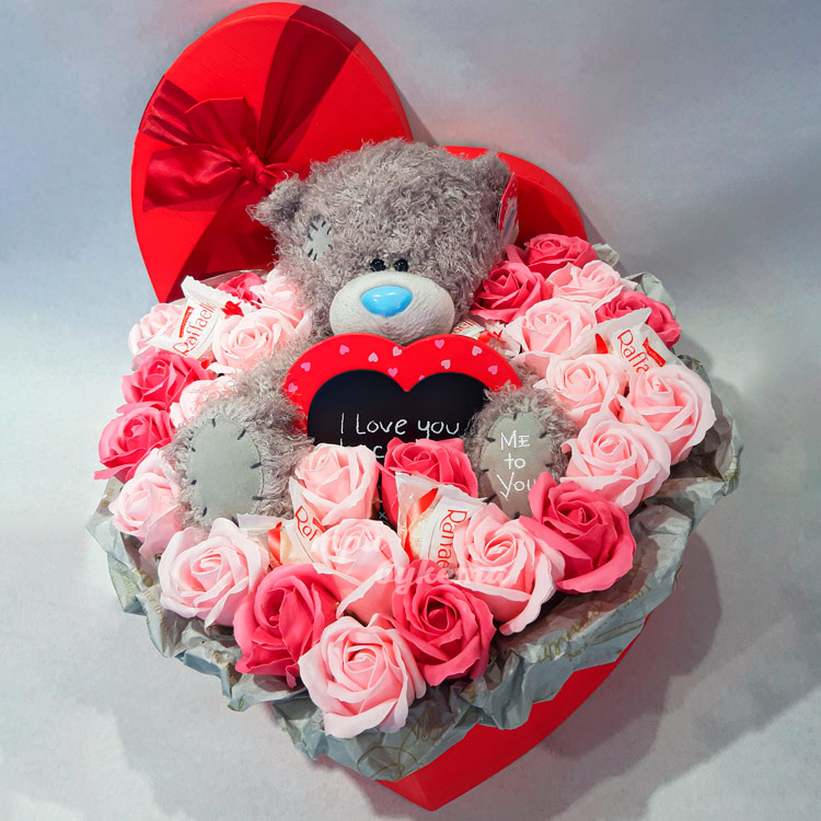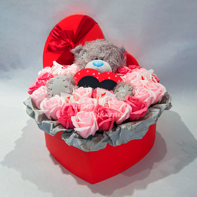Красные мыльные розы с мишкой в коробке