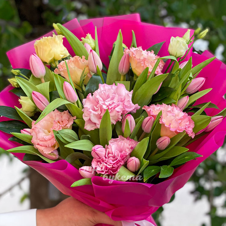 Розовый букет с тюльпанами и эстомами
